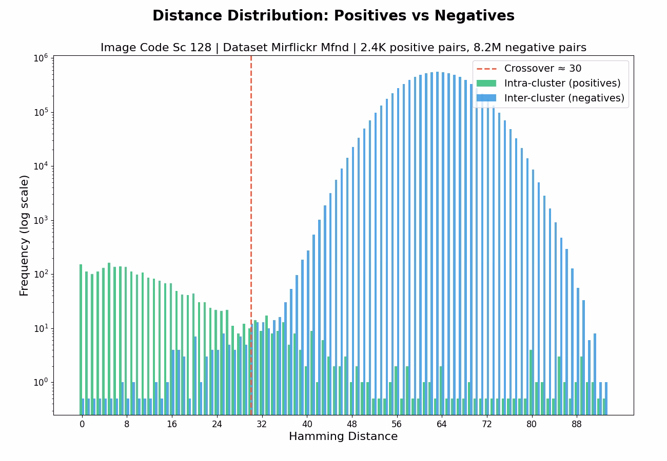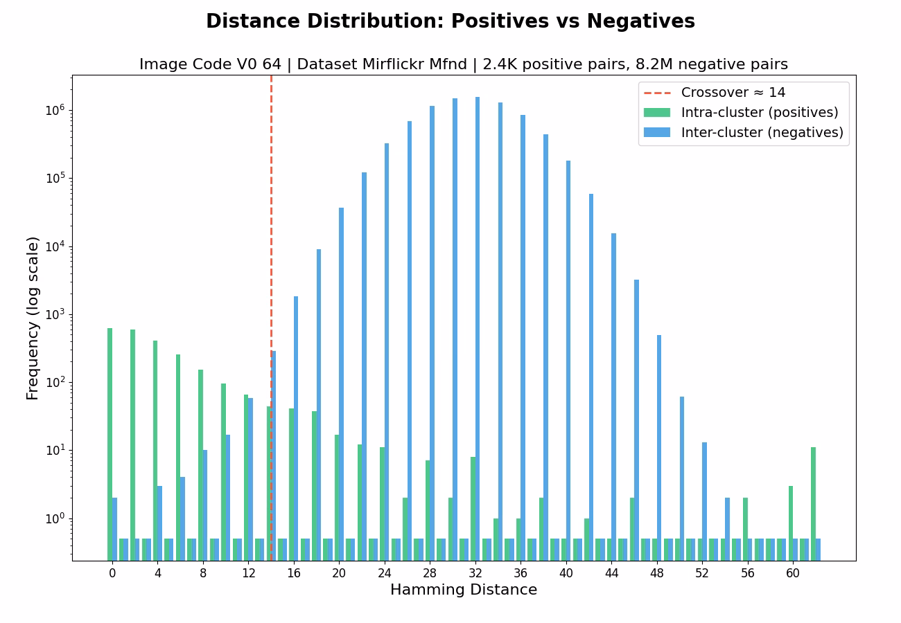 - Blue bars (Inter-cluster/Negatives): Distances between files that are NOT duplicates. These should ideally be large (clustered on the right side).