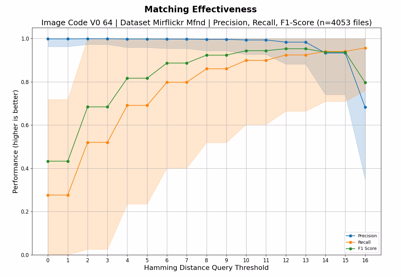 - F1-Score (green): The overall balance between Recall and Precision. Higher is better. A perfect score of 1.0 means all matches were found with no false alarms.